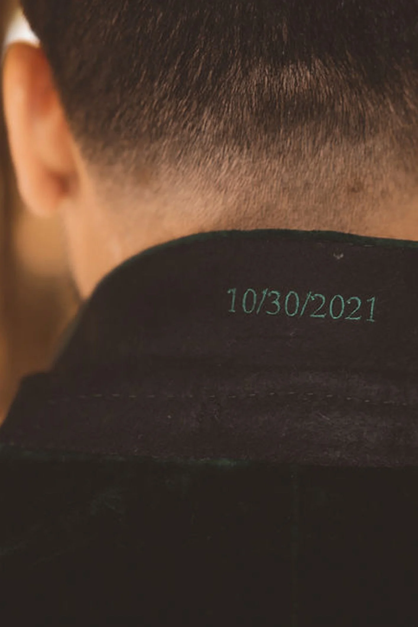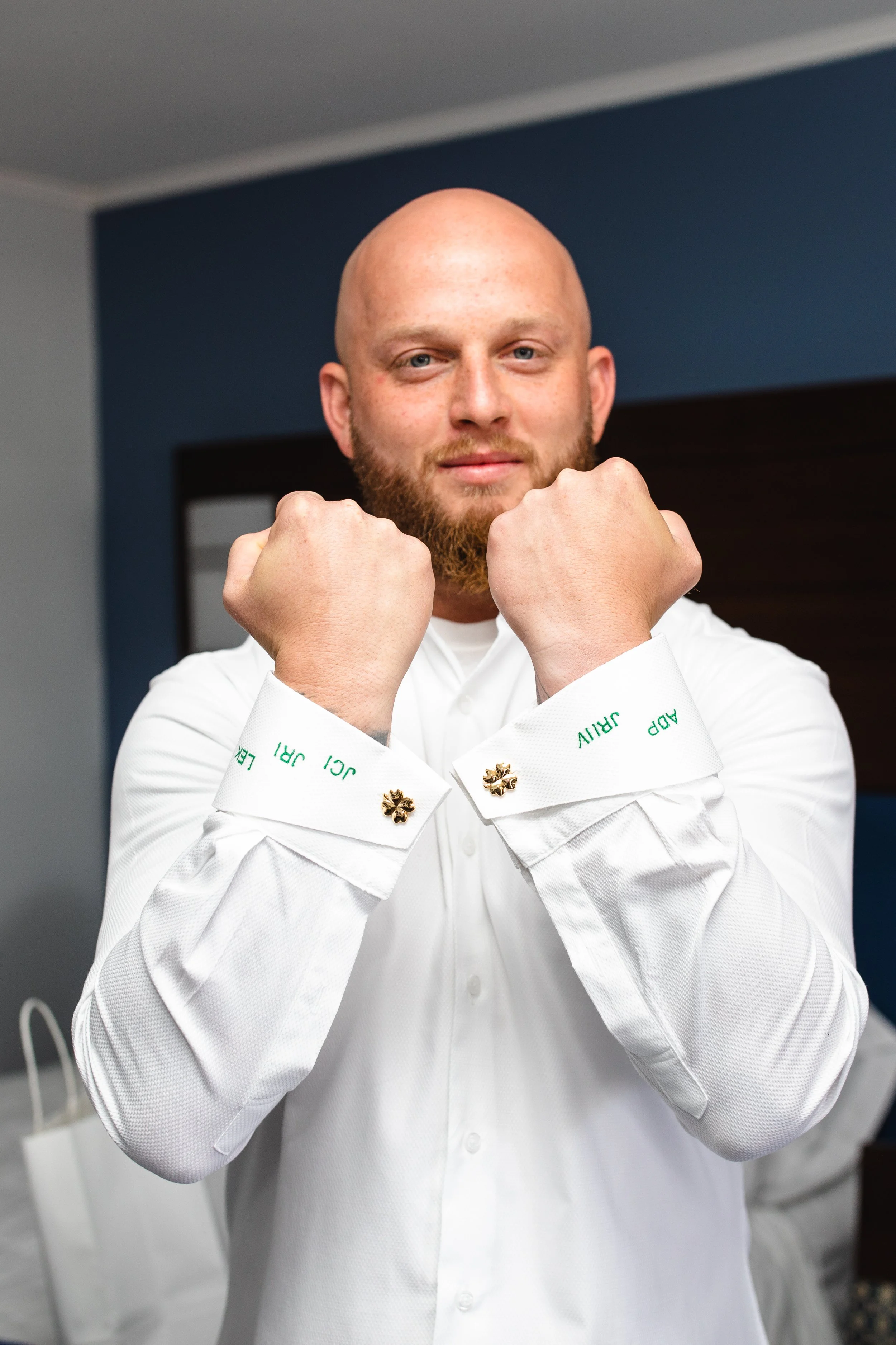A nod to Conner McGregor and his Irish roots, Mr.Kelly chose a plaid three-piece suit and a bright green lapel buttonhole to match the personalized monograms on his shirt cuffs. All tied together with the gold detailing on the pocket square, custom tie and cufflinks. A custom look from head to toe!