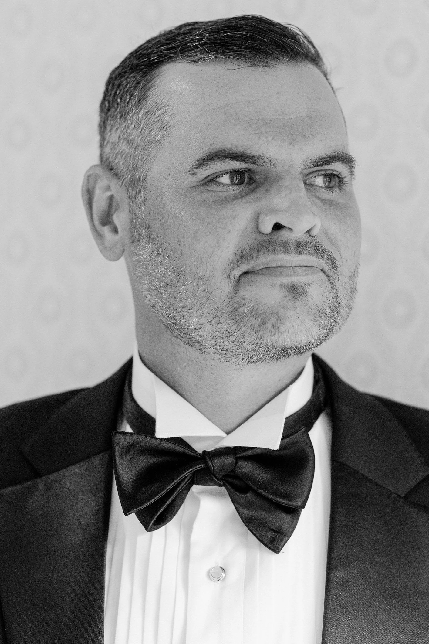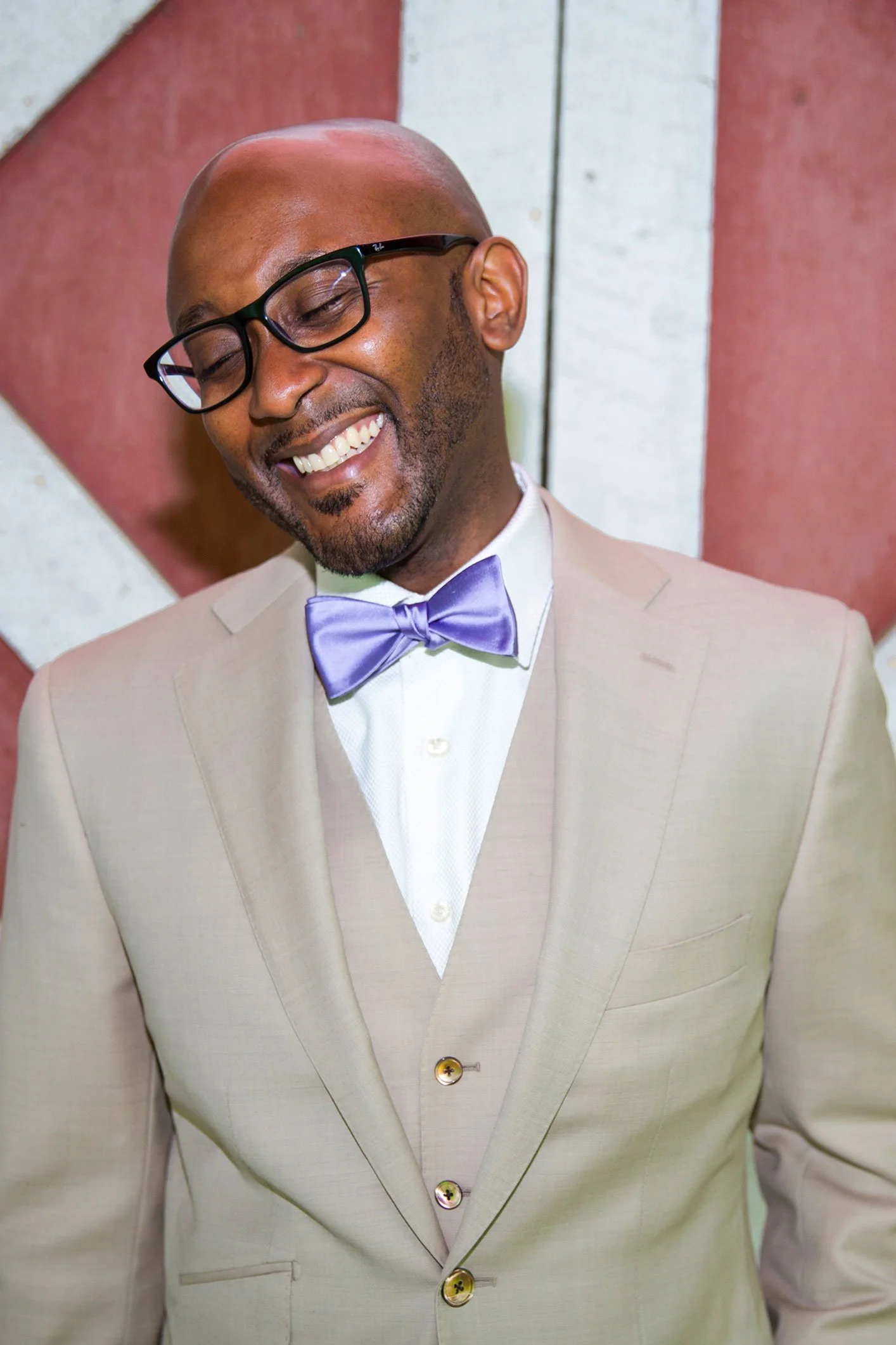 This May day called for a break from the blues and grays of wedding season. Mr. Lebrun opted for a custom three-piece cream suit, with purple accents to match his tie and bow-tie selection. The groomsmen opted for ready-to-wear in the same color, serving as a subtle compliment to their colorful bridesmaid partners.