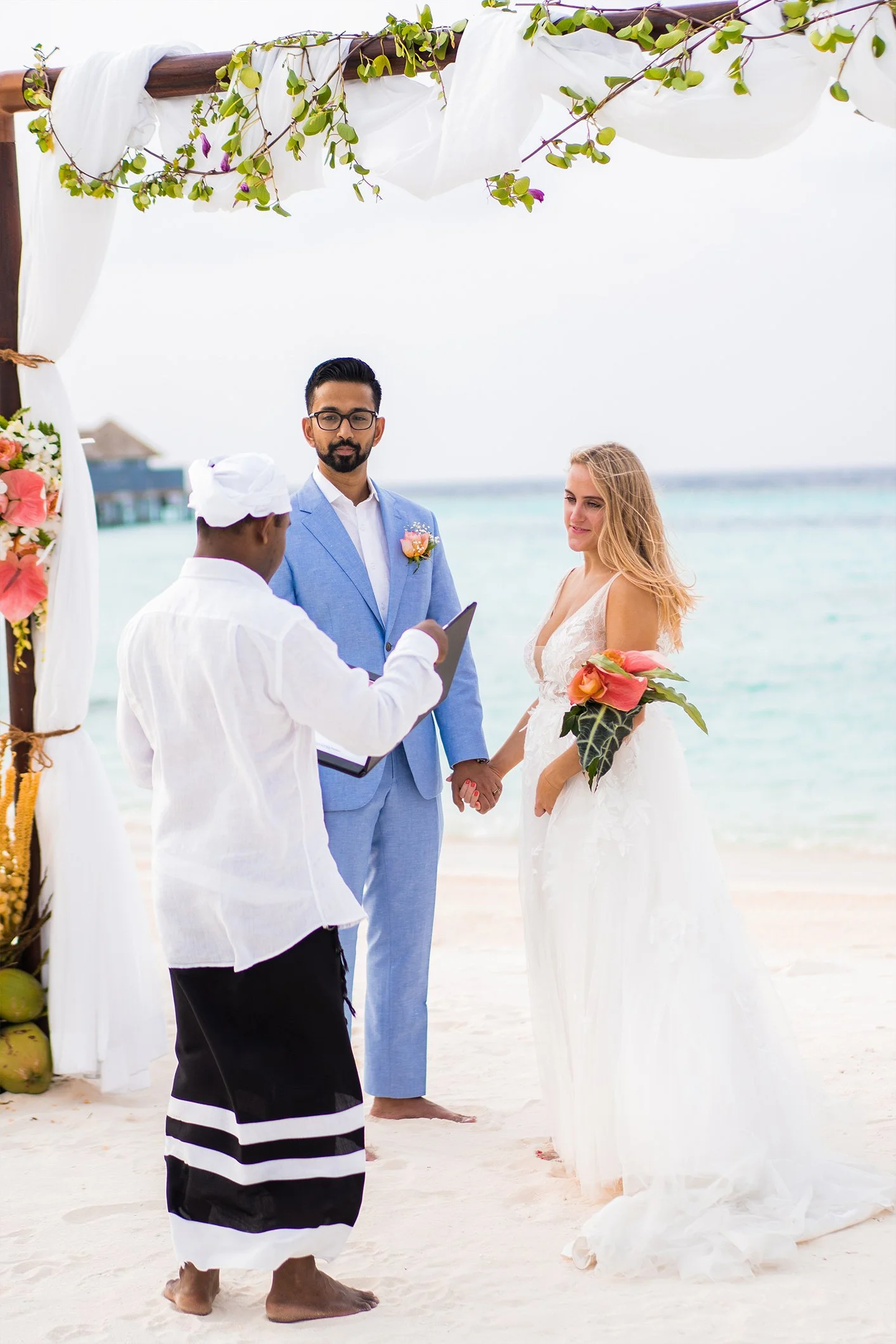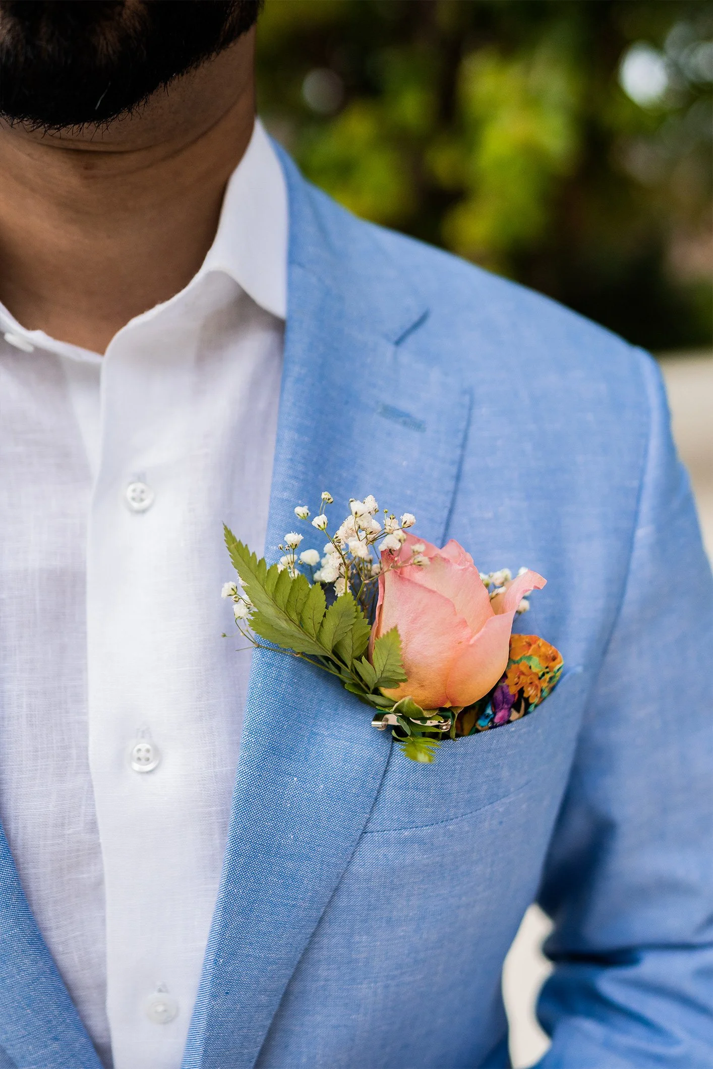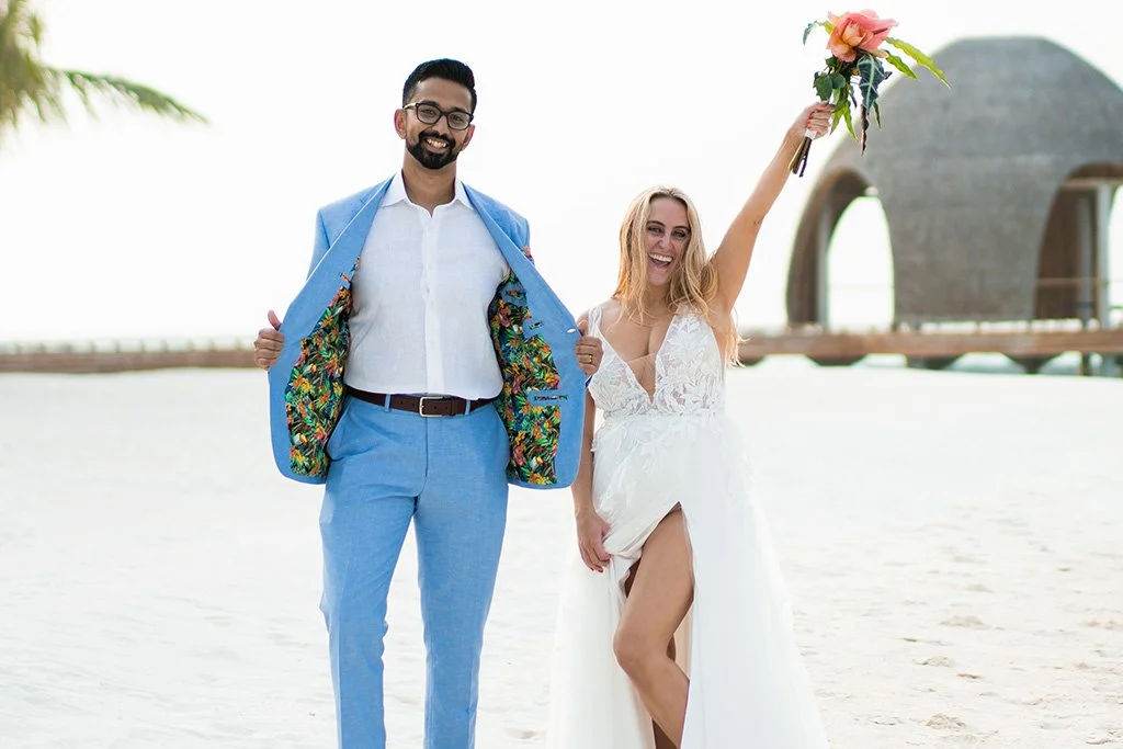 Nothing says romance like an elopement in the Maldives, and nothing said beach wedding better than this baby blue linen suit. Paired with a linen dress shirt for the perfect laid-back but put-together look, and personalized with a colorful, floral lining.