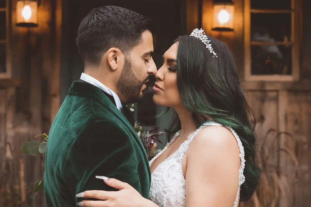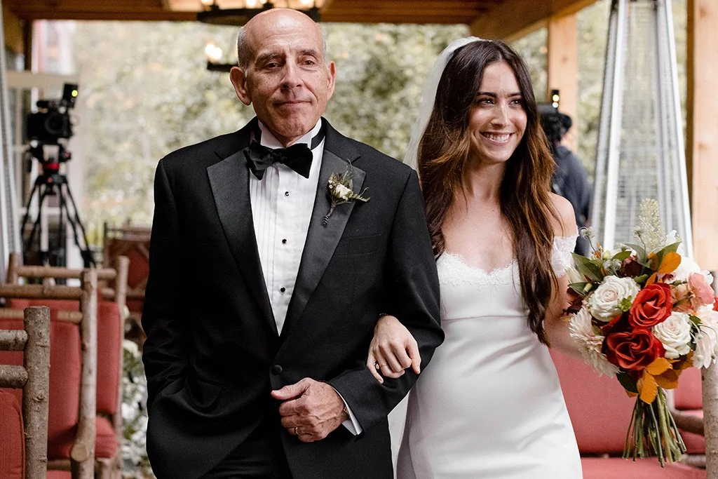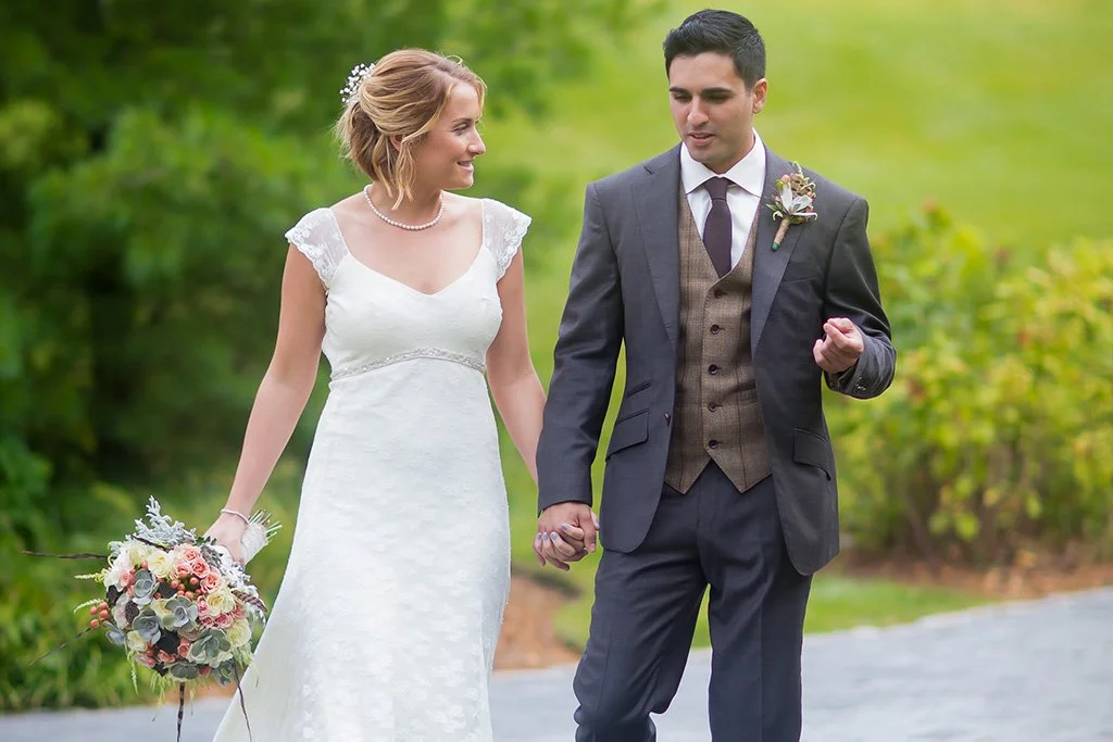 This custom look gave the Garcia family a chance to mark the occasion, literally. A wedding date under the collar, initials on the cuff of a custom shirt, a plaid vest and textured brown tie to tie in all of the accessories. A subtle and smart look for this Fall celebration.