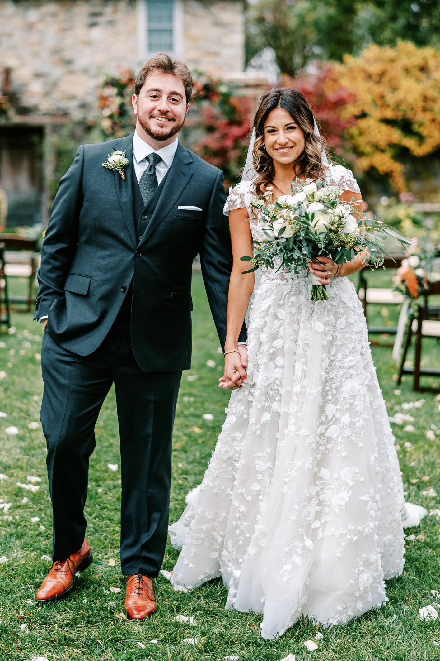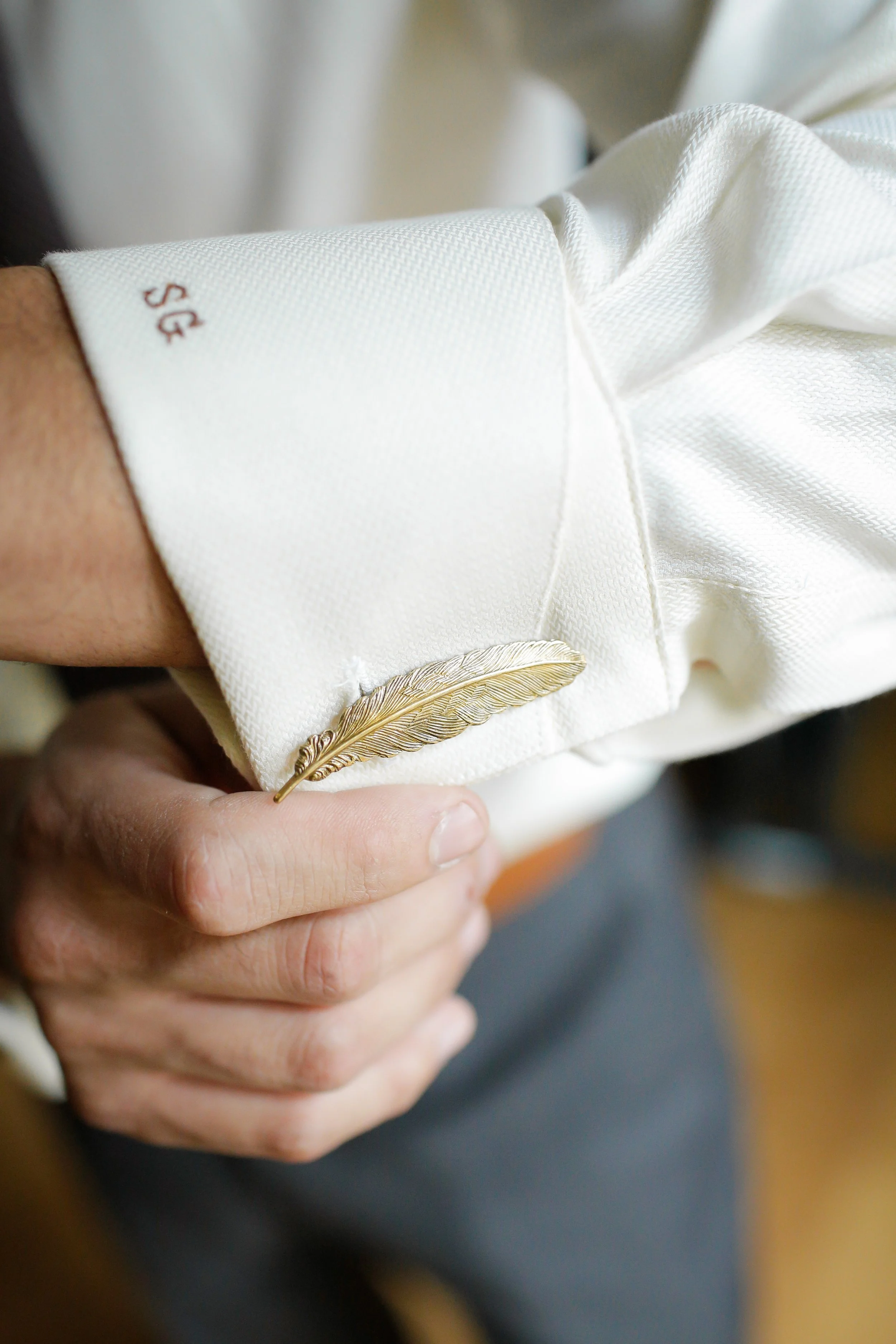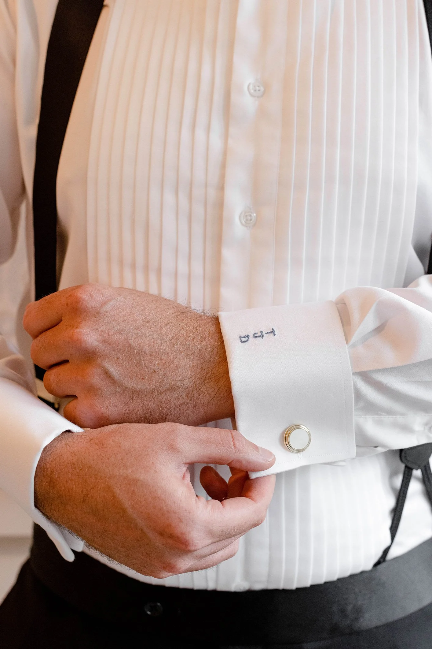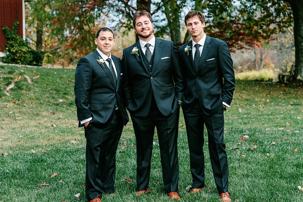This Autumn wedding called for a charcoal grey, three-piece suit, with groomsmen in two-piece suits of the same color. What a way to let those white and green flowers pop. We completed the look with a personalized monogram on the cuff, handmade dress-shoes and accessories all from Onore.