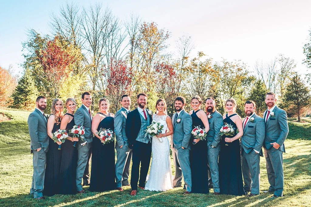 The Desena family opted to buy from our ready-to-wear collection and work in a touch of custom with a plaid vest and pops of cherry red. We tied the whole wedding party together by dressing the groomsmen in grey suits that complimented our groom’s custom vest.